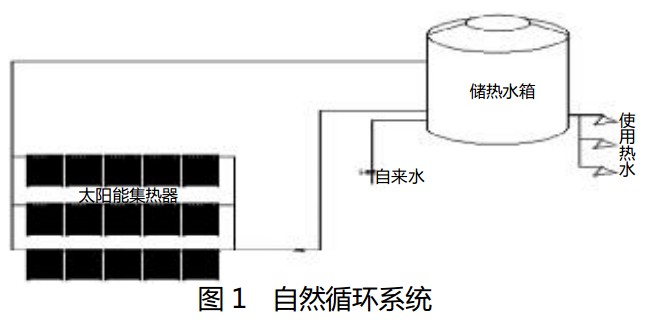 自然循環(huán)系統(tǒng)(見圖1)是最原始的太陽能熱水工程運(yùn)行方式,在太陽能技術(shù)開發(fā)初期應(yīng)用極為廣泛,目前在大型太陽能熱力工程中已經(jīng)被擯棄。