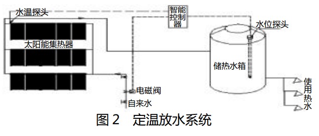 運(yùn)行原理:定溫放水系統(tǒng)(見圖2)是應(yīng)用較為廣泛的太陽能熱水工程運(yùn)行方式,大、小型太陽能熱水工程均適用。在太陽光照條件下,在太陽能集熱器的出水末端增加一個(gè)溫度探頭(水箱內(nèi)的水位可以采用機(jī)械浮球控制也可以采用控制器控制水位探頭)。