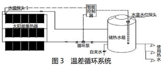 運(yùn)行原理:溫差循環(huán)系統(tǒng)(見圖3)在大型太陽能熱力工程中基本都采用。在太陽光照條件下,在太陽能 熱水器 www.wdmqqbx.cn 的出水末端和儲熱水箱內(nèi)均增加一個(gè)溫度探頭,采用控制器控制,通過設(shè)定溫差控制功能,當(dāng)太陽能集熱器內(nèi)的水溫與儲熱水箱中的水溫之差達(dá)到設(shè)定值時(shí),控制器開始動作,控制啟動熱水循環(huán)泵,把太陽能集熱器中的高溫水和儲熱水箱中的低溫水交換循環(huán);當(dāng)太陽能集熱器中的水溫與儲熱水箱中的水溫之差低于設(shè)定值時(shí),控制器開始動作,停止熱水循環(huán)泵工作;如此不斷循環(huán),從而使整個(gè)儲熱水箱中的水溫升高。