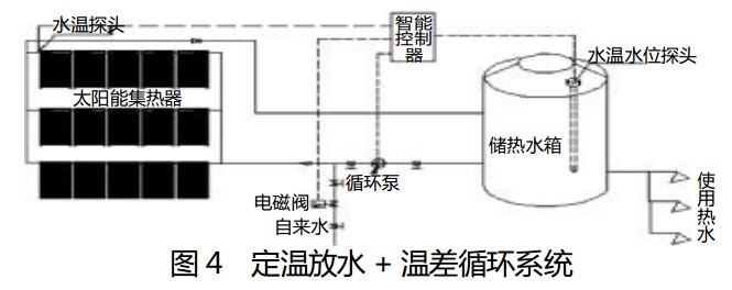 原理:定溫放水+溫差循環(huán)系統(tǒng)(見圖4)采用定溫放水,使進(jìn)入儲熱水箱內(nèi)的水始終是某一較高溫度值,當(dāng)儲熱水箱內(nèi)的水溫降低時(shí),采用溫差循環(huán)控制系統(tǒng),使儲熱水箱內(nèi)的水和太陽能集熱器內(nèi)的水交換。從而始終保持儲熱水箱內(nèi)的水溫為較高溫度,同時(shí)可以采用輔助熱源,這樣就能保證全天候產(chǎn)熱水。