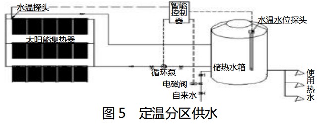 運(yùn)行原理:定溫分區(qū)供水(見圖5)是在“定溫放水+溫差循環(huán)系統(tǒng)”的基礎(chǔ)之上產(chǎn)生的。這種系統(tǒng)運(yùn)行方式通常是在不采用輔助熱源的情況下使用。自來水先進(jìn)入儲熱水箱,通過儲熱水箱內(nèi)的水溫水位探頭將儲熱水箱分為若干個(gè)高度區(qū)域,首次使用自來水上水至一小高度區(qū)域,通過“定溫放水+溫差循環(huán)系統(tǒng)”的方式使這一小區(qū)域水溫較快升高,然后溫度達(dá)到設(shè)定值,控制器打開電磁閥,儲熱水箱內(nèi)的水再上升至一小高度區(qū)域,然后水溫再升高,再進(jìn)水,如此不斷循環(huán),使水溫保持在固定范圍內(nèi)的情況不斷提高儲熱水箱內(nèi)的水位。我們稱這種方式為定溫分區(qū)供水。