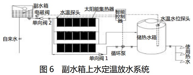 運(yùn)行原理:副水箱上水定溫放水系統(tǒng)(見圖6)在定溫放水基礎(chǔ)上的創(chuàng)新,可以用于典型系統(tǒng)的2、4方式中;驹硗胤潘到y(tǒng)一致,只是上水的方式有所改變,即采用副水箱上水,自來水先進(jìn)副水箱,然后水再從副水箱進(jìn)至太陽能集熱器,下面的方式就同定溫放水系統(tǒng)一致了。