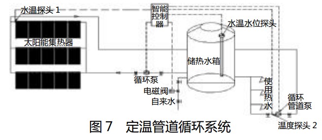 運(yùn)行原理:定溫管道循環(huán)系統(tǒng)(見圖7)在使用熱水的供熱水末端增加一溫度探頭,自動檢測供水末端管路水溫,當(dāng)水溫低于設(shè)定溫度時(shí),控制器開始動作,控制啟動管道熱水循環(huán)泵,把管路中的水與儲熱水箱中的水交換,從而使管路中的水溫不低于設(shè)定值,用戶一打開水龍頭就是熱水。